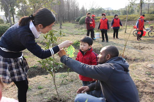 扬州天下东方剑桥幼儿园国际班和大一班的小朋友、社区青年志愿者、红马甲志愿者带着树苗、铁锹、水桶等工具来到了蜀冈西峰脚下进行植树。小朋友们跟志愿者们分工协作,志愿者们负责挖坑、拎水、埋土,小朋友们负责将一株株小树苗放到挖好的坑里。国际班的外教老师也参与到植树活动中来,与小朋友一起种树。在大家的共同努力下,30棵小树苗在蜀冈西峰脚下安了家。