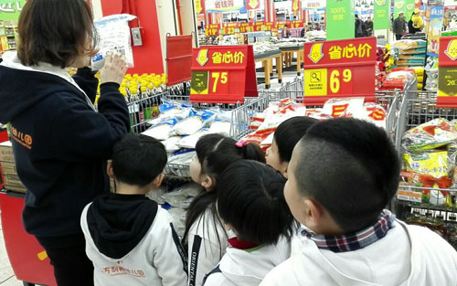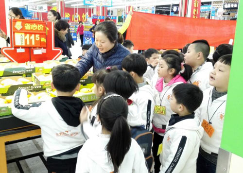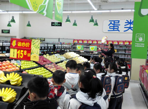 一大早,我们带领孩子们来到了沃尔玛超市,现场教小朋友们认识食品安全标志、绿色食品标志、如何分别保质期等知识,教育孩子们在购物时要查验食品安全标志、生产日期等。如果不小心买到了劣质食品,可以通过拨打12315电话来维护自己的合法权益。文明小卫士们呼吁家长朋友共同关注食品安全,健康消费。