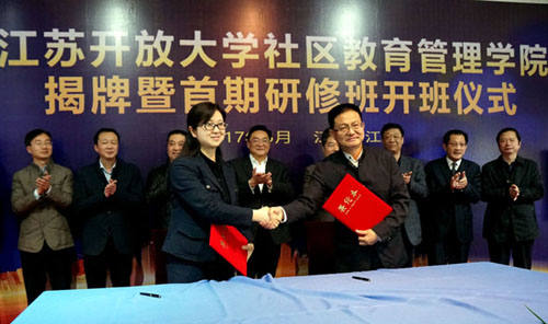 春江花都迎嘉朋,花开龙川别样红。3月30日下午,全国首家社区教育管理学院在江都中专举行了隆重的签约揭牌仪式。江苏开放大学彭坤明书记、崔新有校长、区委蒋爱祥书记和来自全省各市、县开放大学分管社会教育的领导及相关负责同志200余人参加了活动。由江苏开放大学和扬州江都区政府合作共建的社区教育管理学院将立足江苏、面向全国,采用“理论指导、实践探索、混合教学、互动交流”的人才培养机制,通过线上线下结合的开放教育模式,开展社区(老年)教育专、兼职人员培训及社区教育的相关项目培训。社区管理学院的建设为提升社区教育管理和教育水平开启了破冰之旅。