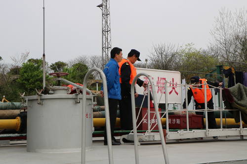 2017年4月6日至15日为南水北调调水期。为确保调水期间辖区内水质安全,扬州市江都区地方海事处城区海事所抽调8名海事执法人员、2艘海巡艇,集中对芒稻船闸上游的石化厂码头作业的危险品船舶以及水工作业涉水工程进行防污染宣传和安全检查。图为检查现场。