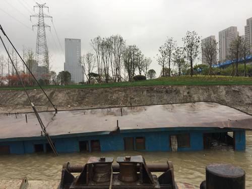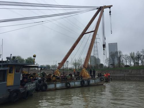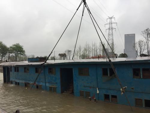 在4月底汛期来临之前,扬州市江都区地方海事处对辖区芒稻河、金湾河、新通扬运河河道内的无主沉船进行集中摸排,对清理范围内的沉船位置、数量、吨位等状况进行核查确认。这些无主沉船不仅给船舶的正常通行造成了诸多安全隐患,而且影响河道泄洪和美观。图为该处工作人员打捞无主船现场。