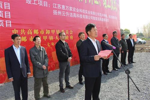 4月12日上午,卸甲镇举行“4.12”六个重大项目集中开竣工仪式,其中,四个开工项目,两个竣工项目,总投资达13亿元。 高邮市副市长李生出席集中开工仪式,并与卸甲镇党委书记夏瑞林、镇长史美山、人大主席周文龙以及项目方代表共同为项目培土奠基。 当天,卸甲镇4个开工项目分别为总投资2.2亿元的高邮永和供应链管理有限公司5.0万平米沙龙物流园项目;总投资2.8亿元的扬州谷瑞因再生资源利用有限公司一期2.5万平米标准化厂房、0.3万平米生产综合楼项目;总投资3.3亿元的苏中循环经济产业园一期3.48万平米科技孵化服务中心项目;总投资1.08亿元的江苏洁澜水务设备有限公司1.8万平米标准化厂房项目, 2个竣工项目分别为总投资1.2亿元的江苏惠万家农业科技有限公司30万平米智能温室大棚,3万平米鲜花交易市场、0.2万平米总花卉种荔组培室项目;投资1.02的扬州云升洁具科技有限公司2万平米新建厂房及附属用房项目,此次开竣工项目涵盖工业、农业、服务业三大产业,规模体量大、潜力后劲足,这是全市重大项目的生动缩影,也是卸甲镇落实市第十一次党代会精神的具体实践。这批项目的开竣工,必将为卸甲镇加快发展奠定更为坚实的基础,为全市发展大局作出新的更大贡献。 李生代表市政府对卸甲镇“4.12”重大项目集中开竣工表示祝贺。他希望卸甲镇要始终坚持“招商为天、项目为王”的理念,在更高层面、更广范围整合资源,努力把项目建设的良好态势转化为加快发展的比较优势,在全面建成更高水平小康社会的进程中走在全市的前列。