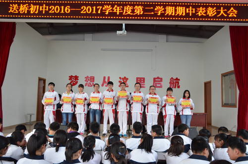 4月26日下午4时,送桥初中会堂锣鼓喧天,400多名师生济济一堂,举行了期中总结表彰会。