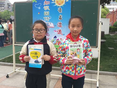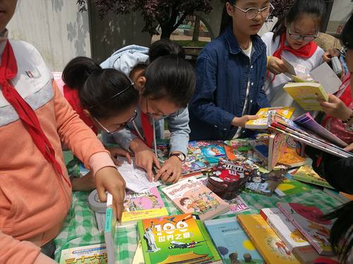 六年级各班的孩子们在操场上摆开了一排排书摊,一转眼,各个摊位前就人头攒动,热闹非凡。书的种类也是五花八门:有低年级学生喜爱的童话故事、百科知识读物,还有中、高年级学生热衷的各种名著,可谓是货源充足。为了吸引“顾客”,“ 摊主”们可谓是“八仙过海、各显神通”:“桃淑吧”、“松竹书斋”……一张张海报色彩鲜艳,童趣盎然,很能吸引眼球; “价格不高、质量超好,别处绝对买不到”……不少孩子还编起了顺口溜进行叫卖;“逸书阁”“ 买一送二、全场3折起”的优惠活动更是深受“顾客”的青睐……