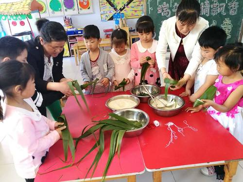 活动中,孩子们和老师在轻松的互动问答题中了解了端午的由来,知道了节日中吃粽子、吃咸鸭蛋、赛龙舟、做香囊等习俗,详细了解了端午节的“粽子文化”。更让孩子们兴奋不已的是---亲自动手包粽子。在老师的悉心指导下,孩子们舞动起了粽叶,手指穿梭,青绿的粽叶、雪白的糯米在他们的手中瞬间便包成了一个个可爱的小粽子。大家看着自己包出来的形态各异的粽子,都忍不住哈哈大笑起来。