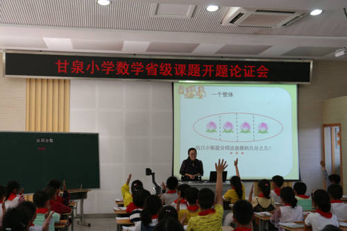 5月25日下午,甘泉小学举行了省级数学课题《在农村小学中实施数学实验教学的策略研究》的开题论证会,扬州市教科所所长夏心军,市数学教研员张秀花,区教育局教研室许健、高静、谈金龙五位专家应邀来校指导。