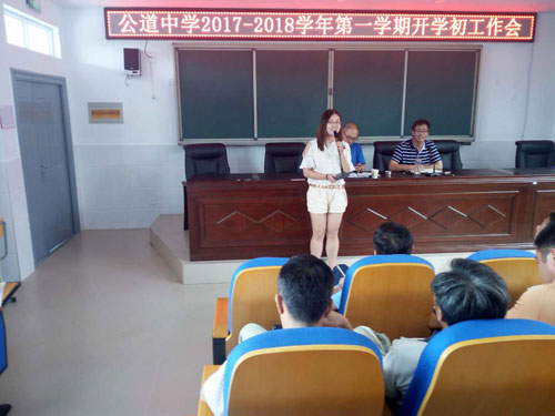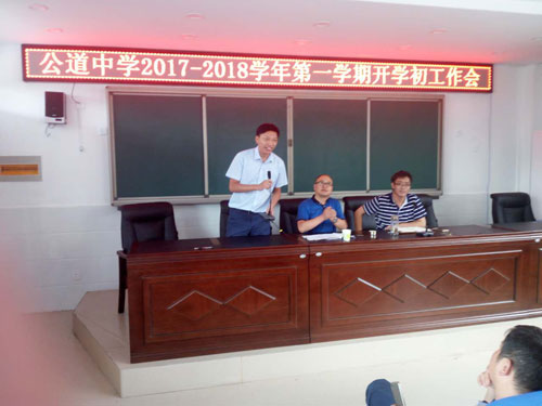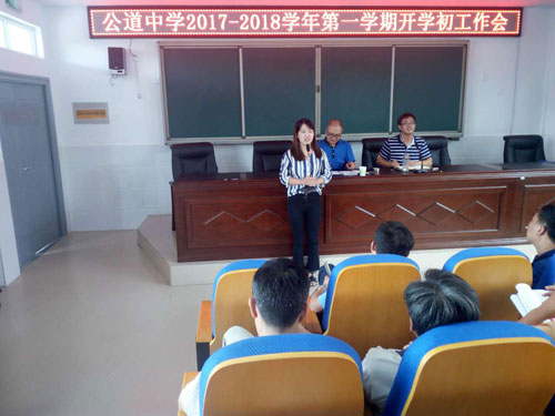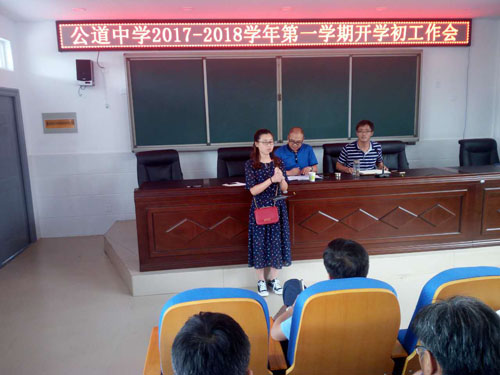 8月26日上午9:00,公道中学全体教职工近150人在学校毓贤楼多功能教室集中,召开了2017-2018学年第一学期开学初会议,会议由学校副校长贡加兵主持。