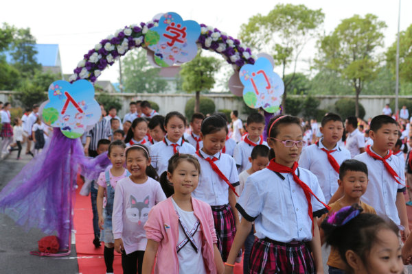 伴随着《生长吧》的音乐,六年级学生牵着一年级新生的小手穿过“入学门”,整齐有序地进入操场,学长们为新生佩戴上校徽,全场响起了热烈的掌声。