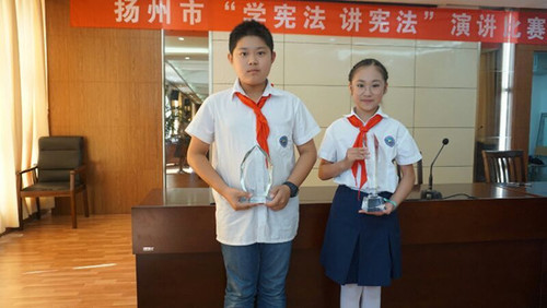 习近平总书记在第3个国家宪法日指出:开展宪法宣传教育是全面依法治国的重要任务。为响应国家号召,提升全市中小学生法治意识,9月16日—17日,扬州市中小学生“学宪法讲宪法”演讲比赛在田家炳实验中学举行。比赛由扬州市教育局主办,以“宪法与国家”“宪法与社会”“宪法与个人”为主题,分小学、初中、高中3个组进行,采取个人演讲和即兴演讲相结合的方式统计最终成绩。 江都国际学校五(2)班滕修涵同学和六(1)班朱酉崔同学作为江都区小学生代表,参加扬州市小学组演讲比赛。经过两天的精彩角逐,他们以出色的演讲技巧和沉着的临场表现,赢得了评委的一致好评,以优异的成绩分获小学组一、二名,包揽冠、亚军。最终,滕修涵同学获得小学组特等奖,朱酉崔同学获得小学组一等奖第一名的好成绩。本周六,江都国际学校滕修函同学将作为唯一的小学组选手,代表扬州市参加江苏省决赛。在决赛中,希望她能充分展现“朝气、才气、大气”的国际学子形象,赛出水平,赛出风格,再创佳绩。