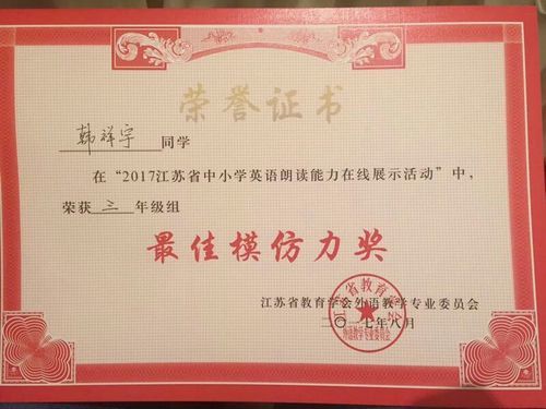 9月17日,韩祥宇同学受邀参加了由江苏省教育学会外语教学专业委员会与清睿教育(口语100)联合举办的江苏省“中小学英语朗读能力展示暨颁奖汇演活动”。在带队老师吉丽的鼓励下,在父母的支持下,韩祥宇同学顺利通过影视配音、短文朗读和专家提问三个环节,获得“最佳模仿力”奖。