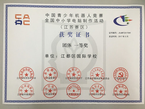 江都国际学校中小学机器人代表队分别成立于2013年和2014年,小学部坚持从五年级开始普及机器人教育,并将对机器人有兴趣的学生专门成立了小学部机器人社团,中学部以实验班为基础,组建了中学部机器人代表队,利用平时课堂和社团时间不间断地进行训练,在历届比赛中都能有学生脱颖而出,获得比赛的一二等奖,但学生的水平参差不齐,培训时间等不稳定因素始终影响团体性奖项的出现,但是辅导教师们没有失望,始终坚持不断改善教学方式,始终坚持尝试各种教学手段,始终坚持加强梯队建设。伴随着一次次比赛成绩的好转,在2017年扬州市第五届机器人大赛、省第十七届机器人大赛中有了历史性的突破,均获得了团体一等奖,在第二届世界青少年机器人创客大赛中,获团体一等奖、优秀组织单位奖。 在9月18号的升旗仪式上,中小学分别对在2016——2017年度获奖的机器人选手进行了现场颁奖,极大地调动了学生的积极性,也为以后更好的开展机器人社团辅导工作做了铺垫。江都国际学校“创客中心”成立以后,在学校的重视下,学生的关注下,会举办更多创客类的活动,丰富学生的业余生活,提高学生的创客素养,让创客之花开满校园。