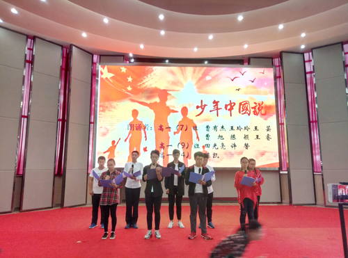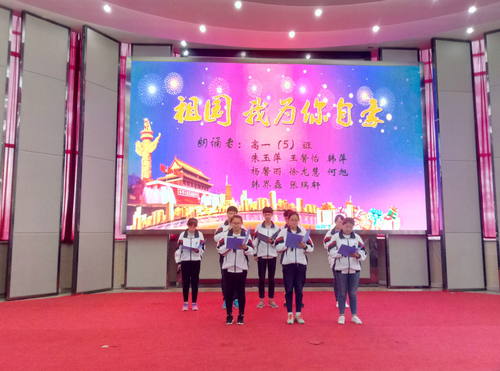 朗诵会上,高二(3)班的郑鑫、张旭同学以舒缓的语调,饱含深情地朗诵了一首《雪落在中国的土地上》,为朗诵会拉开了帷幕。接下来朗诵的同学们在台上都显得那么情感充沛,镇定从容。他们用自己自然流露的肢体语言,深情地抒发了对祖国母亲的热爱和赞美,用浓浓的爱国情感表达着他们担负起振兴中华民族的决心。他们有的深情款款,《祖国我不用言语》柔婉中带着傲气;有的慷慨激昂,《少年中国说》铿锵中透着自信;有的激情洋溢, 《托起中国梦》昂扬中表达了对祖国母亲崇高的敬意,他们将对祖国的深情演绎得淋漓尽致,博得了台下全体师生的阵阵掌声。