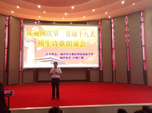 9月28日下午,邵伯高级中学与扬州电台江都广播联合举行了“庆祝国庆节 喜迎十九大”师生诗歌朗诵会。邵伯高级中学王忠东校长首先致辞,对此次活动的主题做了精彩诠释及对到场的嘉宾致以热烈的欢迎和衷心的感谢,同时希望同学们能永葆爱国热情和民族自豪感。