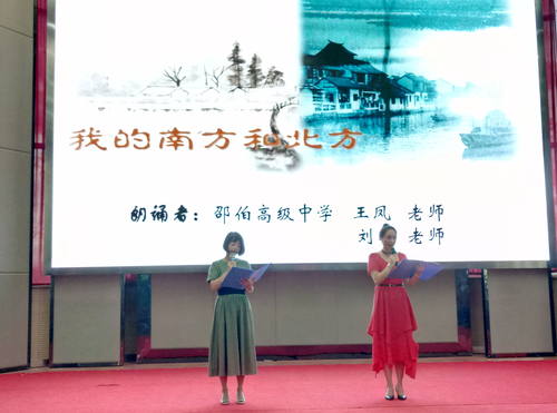 同时,穿插其间的老师们更是将活动推向一个又一个高潮。邬恒梅老师用其平缓疏淡的语调诉说着苦难祖国的曲折命运,她的《我用残损的手掌》为朗诵会书写了序幕;丁云以其抑扬顿挫的语调将《女人》的抒情诗融入祖国的坚韧与厚重;刘芬和王凤老师《我的南方和北方》更是宕开视听的界限,将听者带入祖国南北方的美景,徜徉于祖国博大精深的文化长流;孙文蔚校长《我骄傲 我是中国人》更是带着中国人的种种骄傲,以其强烈的爱国精神将朗诵会引向高潮。