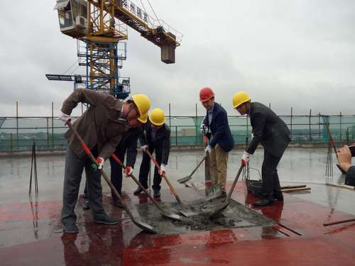 上午10时58分,教学研究中心主体结构(该建筑位居校园东南方向,主体为框架结构,一共5层,合计建筑面积达5164平方)封顶仪式正式开始。濛濛细雨中,相关领导作了简短发言,接着在隆隆的鞭炮声中,参加仪式的各级领导共同为大楼挥锹封顶。虽然天公并不作美,但是大家脸上挂满了笑容,大家都感到由衷的开心,封顶仪式的举行预示着学校教学研究中心工程建设取得了阶段性成果,预计今年年底将全部装修完毕。