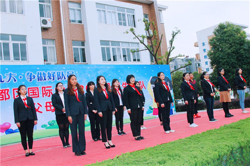 新父母委员会也在今天正式成立。张天斌副校长宣读新父母委员名单,并为25名新成员颁发聘书。仪式最后,刘太祥副主任领读校训,谢兆萍主任带领新队员宣读入队誓词。伴随着一声声稚嫩却激昂有力的誓词,2017级新生入队暨父母委员会成立仪式落下了帷幕。