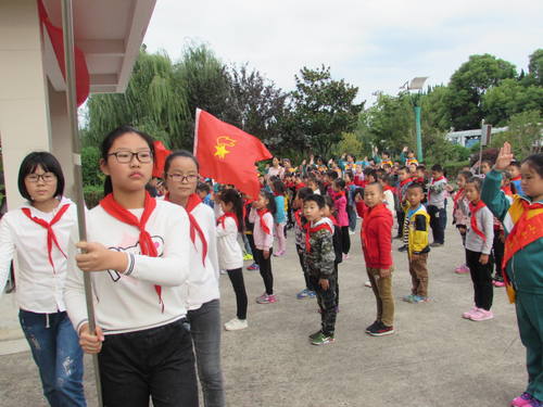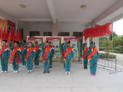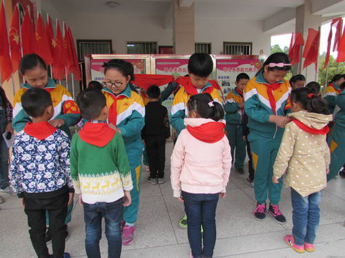 在入队仪式上,一年级90多名新队员光荣的加入了少先队组织,戴上了崭新的红领巾,当鲜艳的红领巾在胸前飘动时,新队员的脸上都洋溢着激动与自豪。随后,大队长茆雨雯带领全体少先队员在队旗下宣誓,一(2)中队的中队辅导员乔丽老师代表新中队作了入队感言。入队仪式之后,学校还举行了少代会,表彰了一批表现优秀的大队干部,并投票选举出一批优秀队员担任新一届大队委员职务。 活动最后,大队辅导员带领全体少先队员在鲜艳的队旗下庄严呼号:“时刻准备着!”-----这句铿锵有力的誓言,表达了全体少先队员对未来无限的憧憬和坚定的信念。 同时也充分显示了作为社会主义事业接班人的信心和决心。
