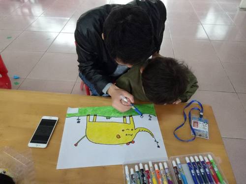在清柔的音乐声中,孩子们和爸爸妈妈一起拿着画笔兴致勃勃地投入到绘画中,只见有的家长涂色;有的家长勾线,有的孩子涂色,作画形式各不相同,有蜡笔画、水彩画、水粉画,内容丰富多彩,统一中又不乏各自的想象。在画纸上,每画一笔,孩子们都怀着喜悦的心情。