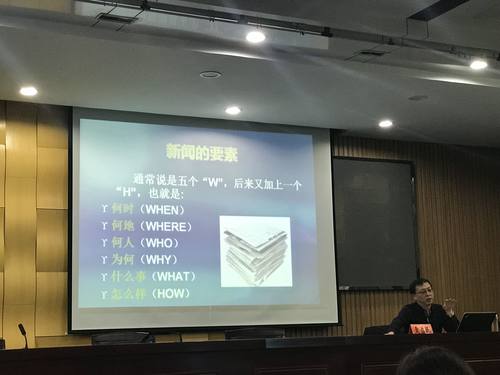 最后,《扬州晚报》副主编袁益民为各校教育通讯员作新闻写作专题讲座。他用幽默风趣的语言,贴近生活的新闻实例向大家讲解了新闻写作的注意事项,聚焦了消息和通讯的本质区别,同时生动的介绍了一条好新闻的标准:真实标题、给人启发、写作手法个性化、读者角度、客观性等。并建议大家多看、多写、多思。