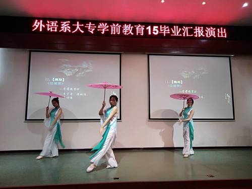 因2015级学前教育学生即将走向实习,故准备了本次汇报演出。虽然排练时间比较短,但同学们凭借着扎实的基本功,仍能在较短的时间内给大家呈现了一台精彩的晚会。演出共15个节目,有舞蹈,有独唱、合唱、弹唱,有钢琴独奏、古筝独奏,节目形式多样,内容丰富多彩,学前教育专业的学生们充分在这个舞台上展示了自己三年所学,他们的精彩表演博得了在场观演的师生们的阵阵掌声。