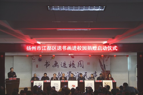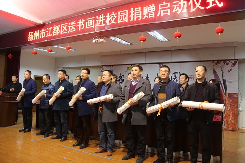 孟冬十月,北风徘徊。11月29日的龙川小学校园内却是暖意融融,因为江都区书画进校园活动启动仪式在这里隆重举行。市老干部局副局长张世江,市文化局副局长蒯玉萍,市老干部书画研究会会长张阶平、副会长孙传余,市教育局基教处处长赵云;江都区文化局局长王声,区教育局局长朱其山,区老干部局副局长吴步云,区老干部书画研究会会长黄德富;还有区老干部书画研究会的40多位老同志,17所接受捐赠学校的分管校长及龙川小学200余名师生参加了活动。区教育局副局长朱庆国亲自主持了活动。