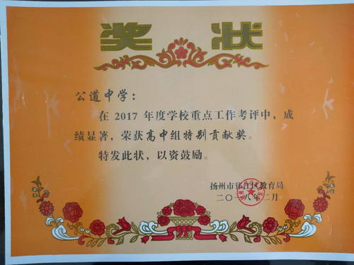 3月1日,新学期伊始,从区委区政府召开的全区“学在邗江深化年”动员大会上传来喜讯,公道中学凭着突出的教育教学实绩,荣获邗江区2017年度教育重点工作考评特别贡献奖等多项荣誉。这些荣誉既展示了公道中学各项工作取得的新成绩,也进一步提升了公道中学的社会美誉度。