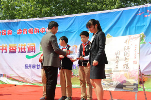 4月19日,世界读书日的前夕,扬城最美的季节,我们甘泉小学的全体师生及部分家长代表盼来了以“书香滋润童年,阅读点亮人生”为主题的阅读节启动仪式。本次活动受到了邗江区图书馆的大力支持,他们将一批孩子们喜爱的图书漂流到甘小;邀请了“儿童阅读推广人”时金林为大家宣读阅读倡议。各个年级为大家准备的节目精彩纷呈:千人诵读充满童趣的《三字经》掀起了开场热潮;耳目一新的古诗诵读及吟唱全场师生齐参与;气势磅礴的《满江红》诵读、振奋人心的《少年中国说》表演将活动推向高潮;学校精品社团展现的《泉韵》更是赢得了阵阵掌声……别具一格的诵读表演,让大家深切地感受到经典的魅力。