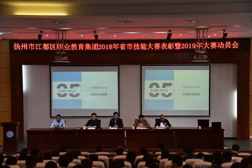 2018年5月8日上午10:30,江都中专在创业楼四楼会议中心召开了“2018年省市技能大赛表彰暨2019年大赛动员大会”。出席大会的成员校长室全体成员以及各系组负责人,教务科分管技能大赛的科长,2018年获得技能大赛的老师、学生、教练组,2019年参赛的选手以及各系的学生代表。