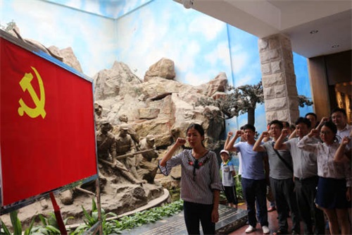 党员们在鲜红的党旗下重温入党誓词,有序参观学习了“苏南人民奋起抗击日本侵略军”、“茅山抗日根据地的开辟”、“茅山新四军东进北上”、“苏南抗日根据地的艰苦坚持”、“苏南人民夺取抗日斗争的胜利”各展区。一幅幅壮烈的历史照片资料,一件件珍贵的抗战文物,纪念碑下激情高亢的号角声……激起了大家对抗战年代的历史回顾,对革命先烈浴血奋战、保家卫国爱国主义精神的无比崇敬。