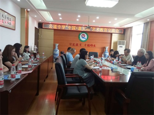 宾主参观完毕后,在宜思楼四楼会议室召开了中意艺术教育会,扬州市贡加兵高中美术名师工作室部分成员,公道中学校长室领导及艺术部全体教师及相关班主任参加了活动。