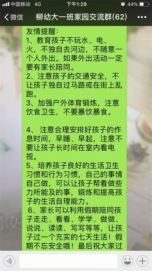幼儿园的安全工作一直是我园一切工作的重中之重,对幼儿进行节日的安全教育是十分有必要的,国庆节到了,为了更好的做好幼儿七天长假的安全工作,柳堡镇中心幼儿园各班老师向幼儿宣传了假期安全常识,并以微信的形式向家长宣传国庆假期注意事项,家园互动,双管齐下,牢筑假期安全防线,祝大家过一个平安快乐的国庆长假!