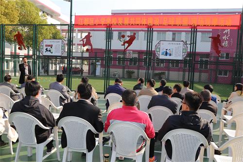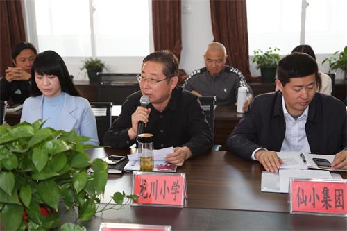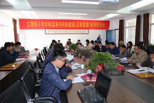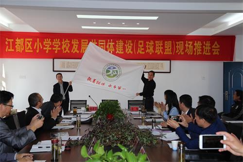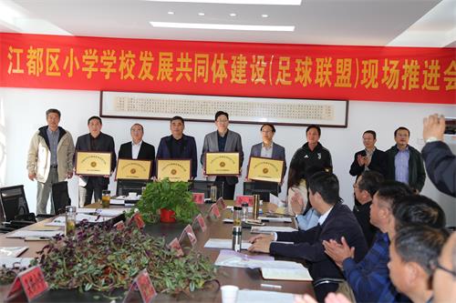 观摩活动结束后,参加活动的领导、教练集中龙川小学行政办公室召开了足球联盟工作会议。会上,龙川小学潘湘云校长解读了《江都区小学学校发展共同体(足球联盟)实施章程》,与会领导向参加活动的十三所学校授予了“全国青少年校园足球特色学校”铜牌,向龙川小学授予了“江都区小学学校发展共同体(足球联盟)”会旗。国际学校、吴桥小学、邵伯小学、曹王小学、高汉小学、正谊小学等成员学校还介绍了各自校园足球的开展情况。