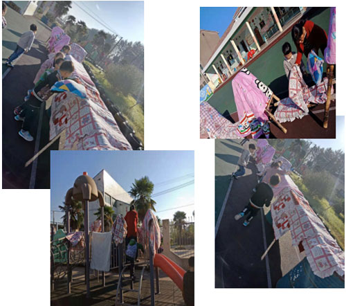 由于郑幼园条件有限,班级没有配备保育员,平时大家既是老师又干保育员的工作。为锻炼孩子们的劳动能力,培养孩子爱劳动、讲卫生的习惯,于是老师们决定今天的晒被子让孩子们一起来参与,使孩子们在身体力行的情况下积极愉快的帮助老师做一些力所能及的事。
