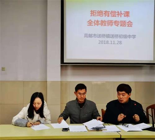 为进一步加强师德师风建设,规范教师从教行为,深入贯彻落实江苏省教育厅《关于开展拒绝有偿补课公开承诺活动的通知》的要求,11月28日下午,送桥初中召开了拒绝有偿补课全体教师专题会。