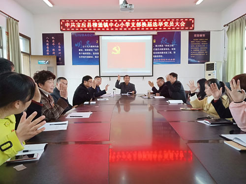 大会在庄重的国歌声中拉开序幕,郑社文同志主持了此次会议,会议首先审议通过了大会的各项议程。随后,纪廷才代表上一届学校支部委员会作了《中共宝应县柳堡镇中心小学支部工作报告》,报告从“政治建设、思想建设、组织建设、作风建设、纪律建设、制度建设”六个方面对上一届柳小党支部工作做了回顾与总结。会议还讨论并审议通过了工作报告、大会选举办法(草案)、新一届党组织委员会委员、书记候选人名单、监票人和计票人名单等。大会严格按照相关程序和步骤,经党员大会无记名、差额投票,纪廷才、郑社文、王宝书、刘武通、郑乃霞五名同志当选为宝应县柳堡镇中心小学党支部新一届委员会委员。随后,学校新一届党支部书记纪廷才代表新一届党组织班子发言,表示将带领新一届党组织班子继续深入推进学校党组织建设,以党建带动学校建设,稳步推进学校各项工作发展,力争把学校党组织打造成柳堡教育的品牌,成为柳堡镇教育系统的优秀党组织。