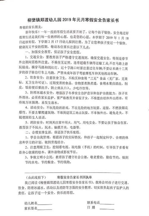 要求班级老师再三跟孩子们强调,假期一定要注意安全,不可以玩火、玩鞭炮等,不可以接触插线板,不可以触摸电视、冰箱、电脑、手机等家用电器的接线口,不可以开关天然气,不可以在没有大人陪伴或允许的情况下到周围冰面上玩耍,不可以吃陌生人的食物或跟陌生人走等,向幼儿宣传寒假期间的各种安全常识,并通过微信家长群、发放《寒假安全告家长书》等形式向家长宣传寒假安全教育的重要性和方法,号召家长积极履行监护人的职责,家园配合共同做好幼儿的安全防范工作。幼儿园还积极制定安全值班表,保证寒假期间24小时有人值班,确保寒假期间幼儿园的安全与稳定。