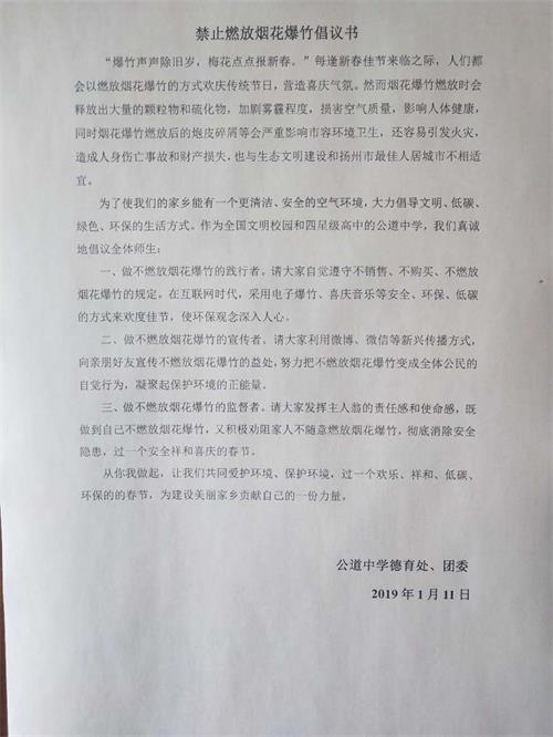 1月14日,公道中学全体师生齐聚学校操场,在学校团委书记圣晶晶老师的主持下,首先由高二(11)许灿同学宣读了“公道中学禁止燃放烟花爆竹”的倡议书,呼吁全体学生做不燃放烟花爆竹的践行者、宣传者、监督者,共同爱护环境,严格遵守“禁止燃放烟花爆竹”的要求,为建议我们美丽家乡贡献自己的一份力量。
