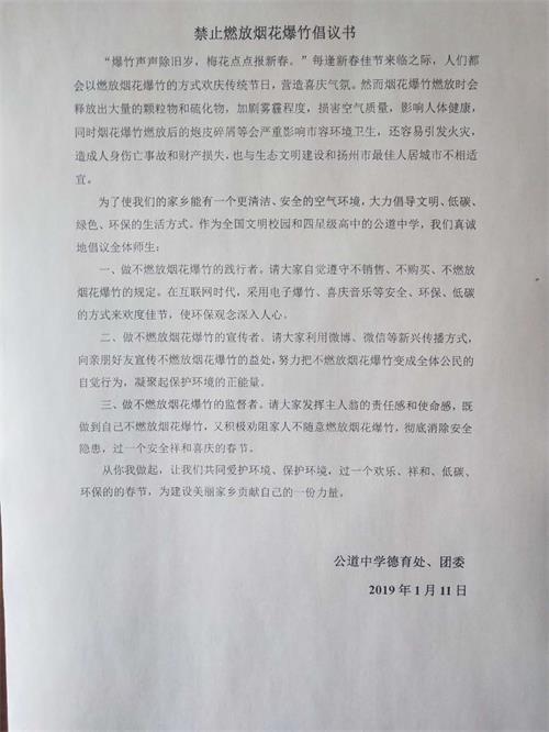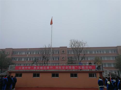 对于校园安全问题,公道中学一直以来都高度重视。在近期的校务会议上,总务处主任卜雪林等传达了有关上级文件精神,校长室专门就此部署了相关工作,还提出了有关工作的要求,以确保学校师生校园内的安全。德育处和年级组也于近期开展了“禁放烟花爆竹,消除安全隐患”等安全主题教育活动,还发出了有关安全行为的倡议书。