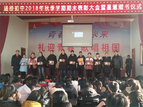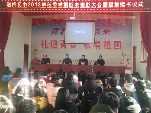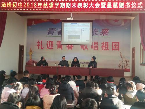 1月26日早晨8时,冬天的太阳,依旧温暖,送桥初中会堂内人声鼎沸,2018~2019学年度第一学期期末表彰会暨星慧集团奖学赠书仪式如期举行。