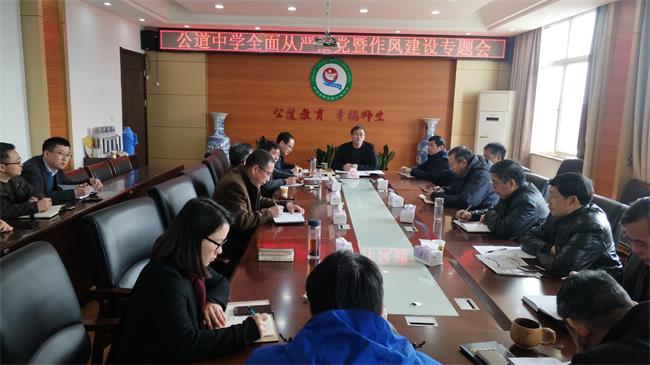 2019年3月25日上午,公道中学召开全面从严治党暨作风建设专题会议,进一步落实学校党员干部的主体责任,端正思想作风,倡导优良师风,纯洁学校敬业奉献、教书育人氛围,为办好高品质公道教育提供重要保障。