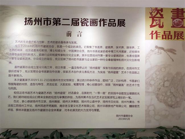 5月11日上午, 由扬州晚报与扬州市文联主办的扬州名家画瓷暨扬州市第二届瓷画作品展”扬州市文化馆举行揭幕仪式,本次活动由扬州市瓷画协会、扬州公道中学等单位共同承办,扬州市政府余挺副市长、扬州市文联、扬州大学美院等领导及扬州大学美院、公道中学师生一百五十余人参加了揭幕仪式。