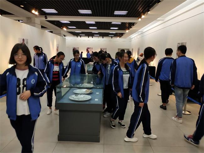 揭幕仪式结束以后,公道中学高一年级的100余名艺术生在张贵斌、赵永琴、吴天红、周朝梅等老师的带领下,在扬州市文化馆一楼瓷画作品展厅进行了观摩,同学们近距离的仔细欣赏了这100余件瓷画作品,这些瓷画作品凝聚了作者大量心血和巧妙构思,将绘画和瓷器结合创作的瓷画艺术,不仅丰富了中国画表现样式,也让公中的同学们带来了全新的视觉与审美的体验,让耳目一新、开拓视野。同学们在老师的带领下,还兴趣盎然的参观了文化馆二楼——扬州非遗文化展厅。