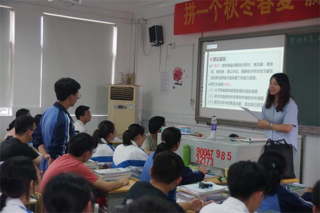 此次活动分为两个环节,首先由扬州中学的胡旻彦老师在高三(8)班开设了一节题为《文学类文本之探究题》的展示课。课堂上,胡老师教学目标明确,环节清晰,带领着学生有层次地进行类题探究,分析答题的角度,总结答题规律。在课堂中,在教师的引导启发下,学生的主体地位凸显,课堂效果显著。