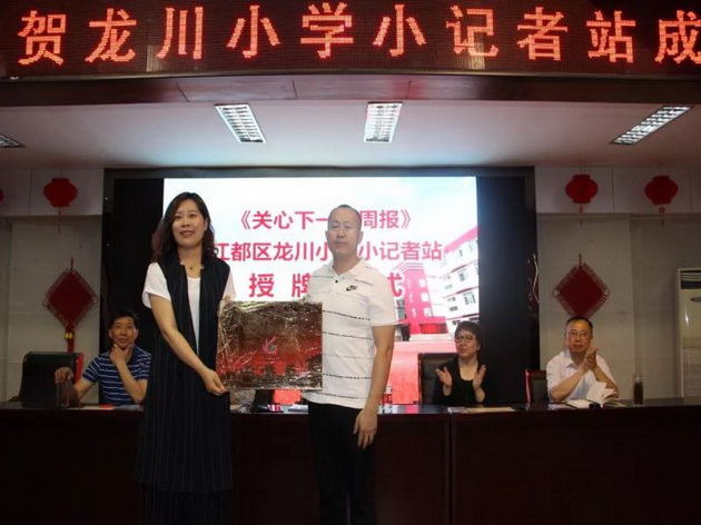 龙川小学韩莉副校长接受了毛副社长授予的小记者站的铜牌,并在授牌仪式上发表了热情洋溢的讲话,她希望辅导老师们认真指导,鼓励小记者们努力写作,充分发挥小记者的职能作用,争取多出精品佳作,将来能成为一名出色的大记者!