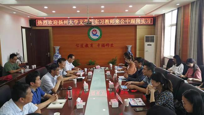 2019年9月3日上午,在扬州大学文学院王定勇副院长率领下,扬州大学文学院陈莉主任、李现乐副教授及10名实习教师来到了公道中学,他们的到来受到了学校师生的热烈欢迎。公道中学沈文涛校长等领导及学校语文名师团队10名代表参加了师徒结对仪式。