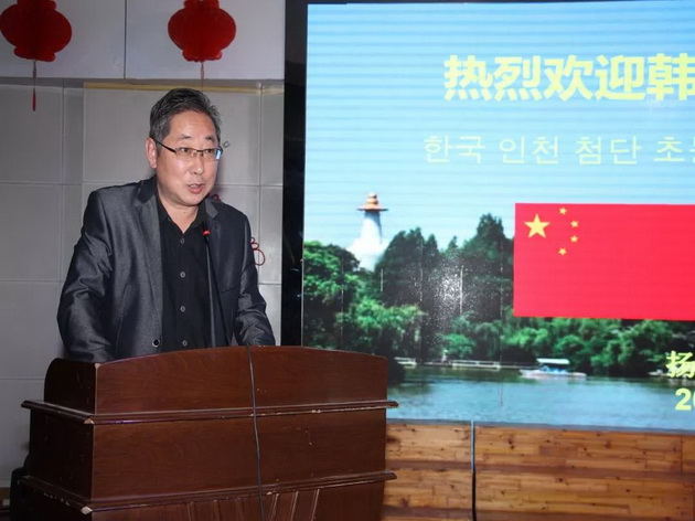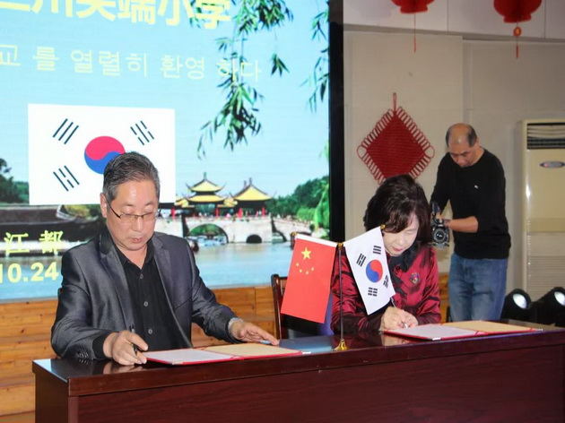 下午2:00,中韩小朋友欢聚在龙川小学报告厅。首先进行的是友好学校签字仪式。仪式由韩莉副校长主持,龙川小学潘湘云校长致欢迎辞,他热情欢迎韩国同仁和学生的到来,着力介绍了家乡扬州和书香水韵的校园文化特色,祝愿韩国友人此次旅途愉快;韩国仁川尖端小学金美香校长致答谢辞,她感谢中国龙川小学师生的热情接待,并希望大家去韩国交流、作客。接着宾主双方签约、互赠礼品。区教育局陈涛副局长也参加了活动,还就双方结为友好学校发表热情洋溢的贺词。