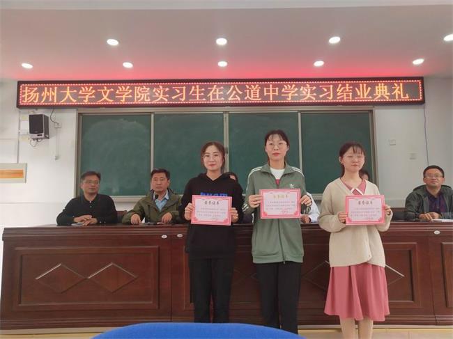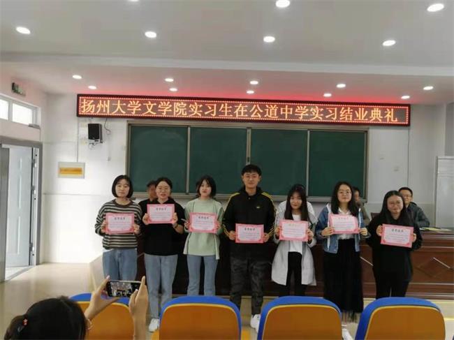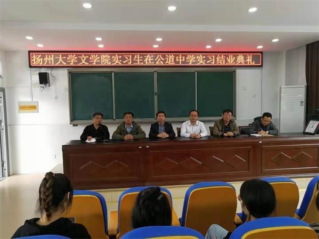 10月25日,扬州大学文学院10名实习生在公道中学为期50天的跟岗实习圆满结束。学校李兆兵副校长、徐伟副书记、盛传云副校长、吴正兵校长助理、教科处夏新翼副主任、王忠祥老师及扬大实习生出席了结业典礼。