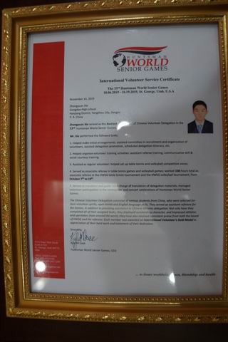 扬州市邗江区公道中学高一年级4班学生谢忠源同学,于2019年10月5日至10月23日,作为国际志愿者参加在美国举办的2019年亨斯曼世界中老年运动会的志愿者服务工作,因为表现突出获得亨斯曼世界中老年运动会国际志愿者金奖。