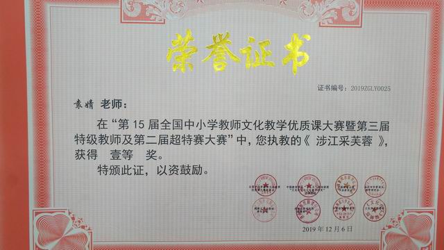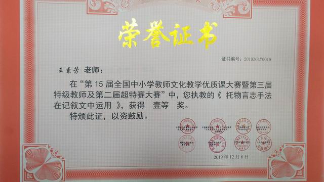 12月4日至6日,在山东临沂举办了“第15届全国中小学教师文化作文与文化教学优质课大赛暨第三届特级教师大赛及第二届超特赛”,公道中学语文组王素芳、袁婧两位老师参赛,均获得一等奖。