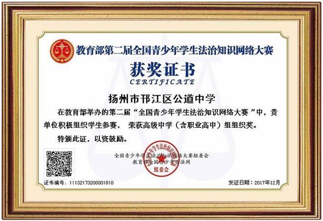 德育处与电教中心密切合作,广泛宣传组织学生参加“全国青少年学生法治知识网络大赛”,取得了一定成果。2019年全校已有多个班级参加比赛;2018年全校合计有23个班学生参加比赛,有多人荣获一等奖,学校荣获第二届全国青少年学生法治知识网络大赛(高中组)组织奖。2017年,学校代表邗江区参加了扬州市教育局和扬州市法治办联合组织的“学宪法,讲宪法”演讲比赛,荣获扬州市比赛二等奖。